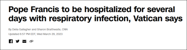 (观察者网讯)据美国有线电视新闻网(CNN)报道,梵蒂冈方面当地时间3月29日表示,86岁高龄的罗马教皇方济各因呼吸道感染,需要在罗马的一家医院住院“数天”。