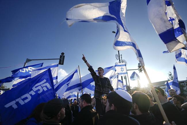 当地时间2023年3月27日,耶路撒冷,以色列总理本雅明·内塔尼亚胡的司法改革计划的支持者在耶路撒冷议会附近集会。