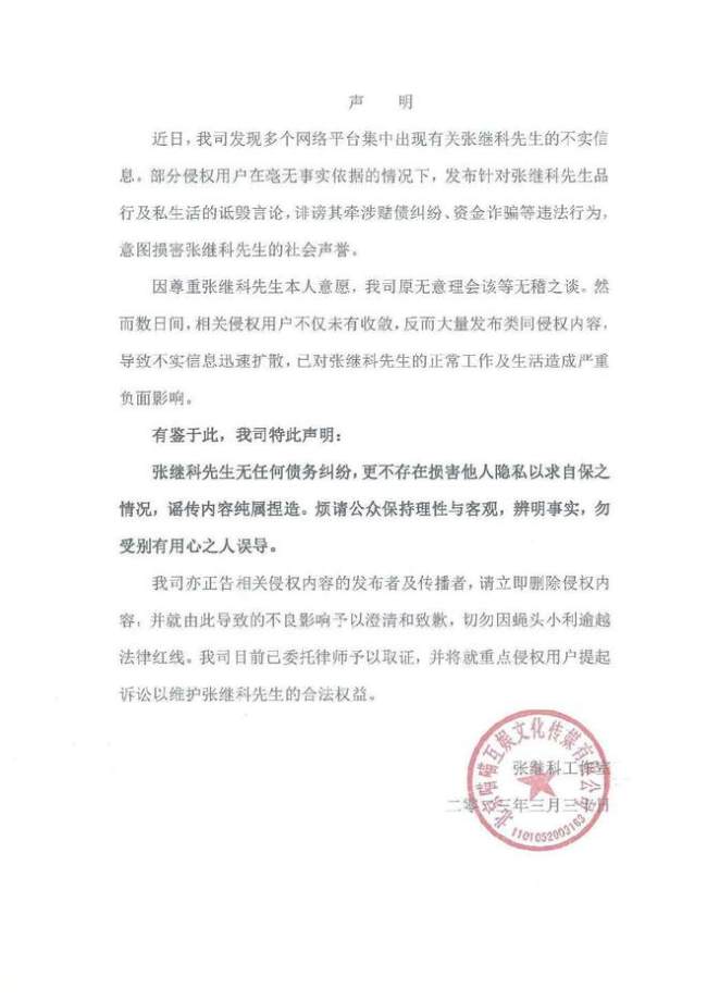 针对网传“张继科欠赌债卖私密照还债”的相关消息,早在3月30日晚,张继科工作室发布声明称,部分侵权用户在毫无事实依据的情况下,发布针对张继科先生品行及私生活的诋毁言论,诽谤其牵涉赌债纠纷、资金诈骗等违法行为,意图损害张继科先生的社会声誉。