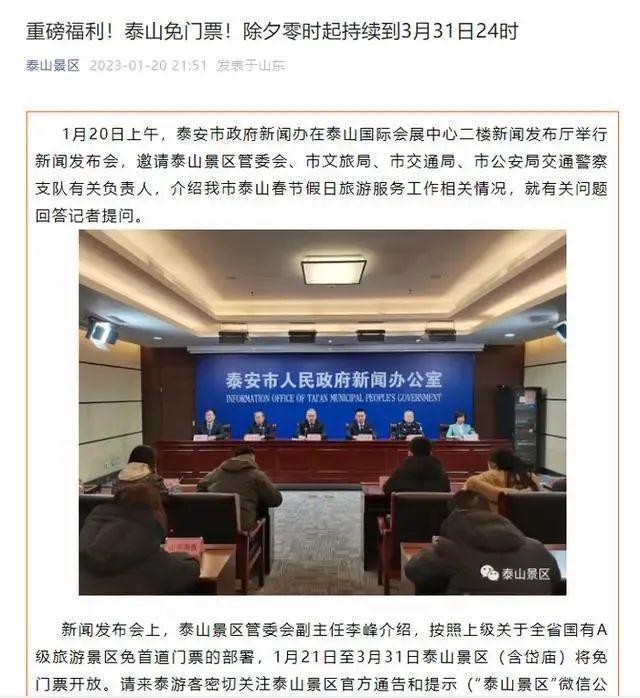 今年1月21日至3月31日,泰山景区(含岱庙)对全国游客免门票。