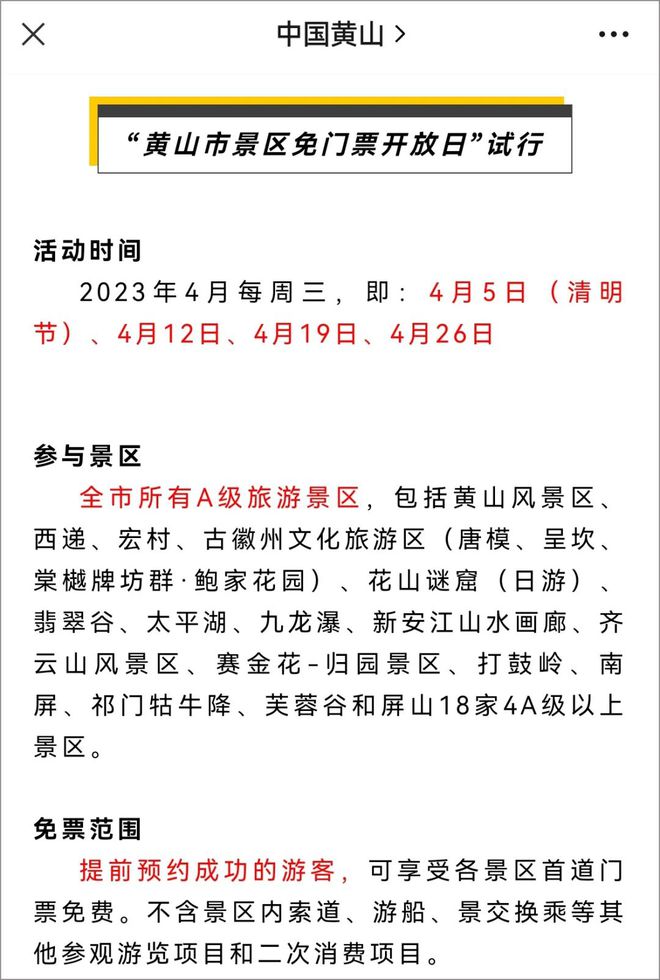 当地将把4月每周三设为“黄山市景区免门票开放日”,即:4月5日(清明节)、12日、19日和26日,共4天。提前预约成功的游客,可享受各景区首道门票(俗称大门票)免费。