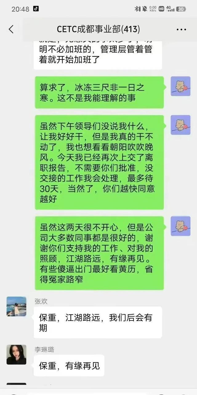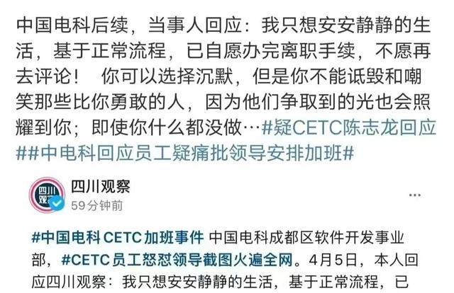 中电科九零后陈志龙因加班怒怼领导一事在网络上爆火,一时之间,陈同学成为平民英雄!因为他敢为天下先,说出了大多数人的心声。目前陈同学已经自愿办好了离职手续,准备开始安安静静的生活!