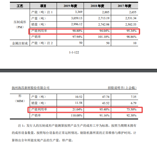 海昌新材主要使用PM、MIM两种工艺生产粉末冶金零部件。海昌新材压制成形2019年比2018年产能利用率下降到仅90%左右,而且,这还是调整以后的数据。而金属注射成形2019年度产能利用率,更是下降到仅21.04%。