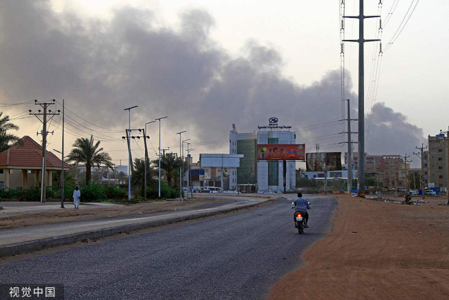 当地时间2023年4月16日,苏丹喀土穆,居民楼上空浓烟滚滚。人民视觉图