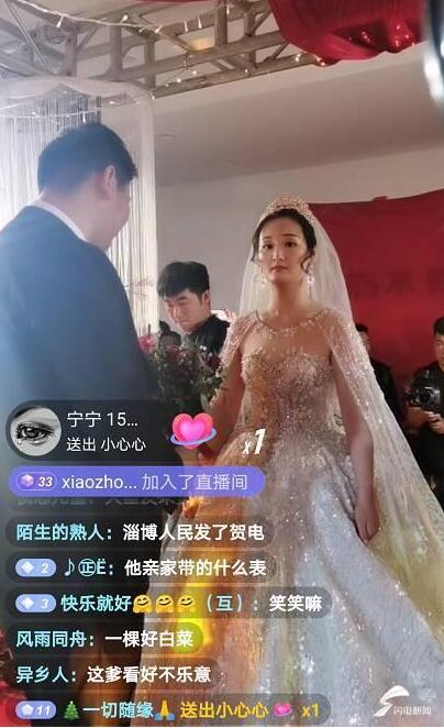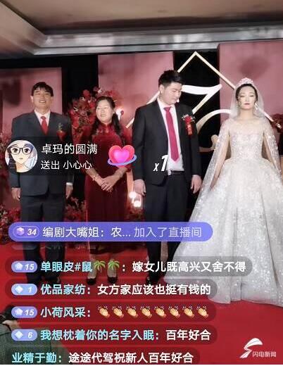 闪电新闻注意到,在这场婚礼直播中,数十万网友在线围观,并送上祝福。“恭喜大衣哥、大衣嫂,喜提儿媳!”“吉林人民发来贺电!”“河南人民发来贺电!”“好人有好报,祝朱家全家幸福、美满!”“祝新人白头到老、永结同心!”
