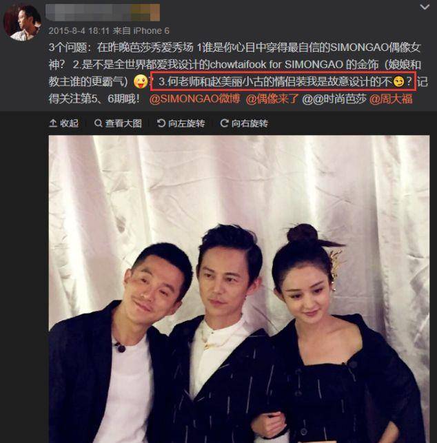 那时分有个有趣的细节,圈里著名的设计师曾经为两人单独设计了一套情侣装,还反问粉丝们他是不是成心的?看看那时赵丽颖脸上的表情,还紧紧挽着何炅的手臂,真是有点甘美。