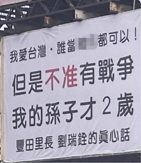 据岛内绿媒《自由时报》报道,台中市丰原区国民党籍丰田里长刘瑞铨,最近在丰原大道二段及丰南街口架设广告牌“我爱台湾,谁当总统都可以!但是不准有战争,我的孙子才2岁”,并署上“丰田里长刘瑞铨的真心话”。对于为什么架设这样的广告牌,刘瑞铨称,他的孙子今年才2岁,他不想台湾发生战争,所以想通过广告牌呼吁大家反战争、要和平。