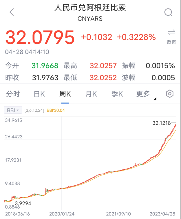 大家看看下面的图:2018年的时候,1人民币能换3.9阿根廷比索。但是,现在1人民币能换32阿根廷比索。而且这个上涨趋势还在加速。