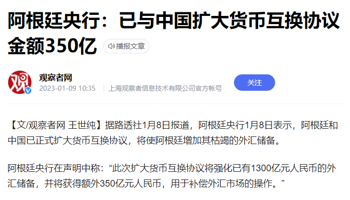 目前,阿根廷通过与中国进行“货币互换协议”,从中国获得了1300亿的人民币,并激活了350亿元人民币可支配额度。