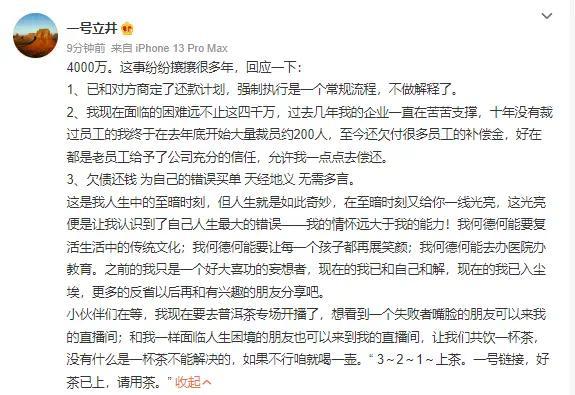 4月28日,李亚鹏在社交平台回应被强制执行4000万,表示已经和对方商定了还款计划,强制执行是一个常规流程。