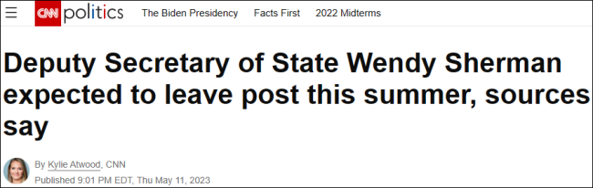 【文/观察者网 熊超然】当地时间5月11日,美国有线电视新闻网(CNN)援引三名知情人士报道称,美国常务副国务卿温迪·舍曼(Wendy Sherman)预计将于今年夏季离职。据悉,有关她的离职消息预计将在未来几天宣布。
