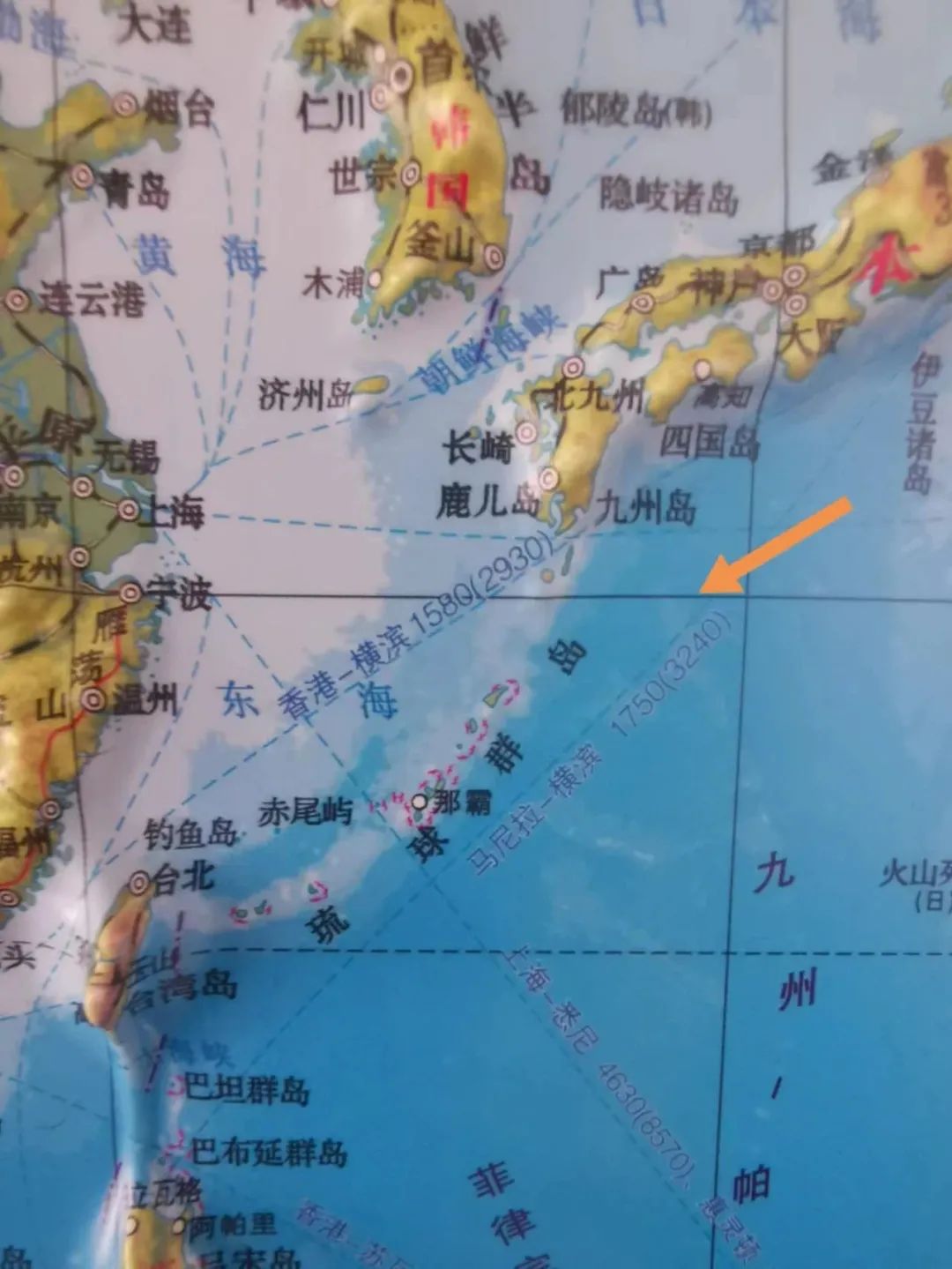 我在文中给朋友们配了一张照片,这张照片是我用我自己的手机拍的我书房里挂的世界地图,那是山东省地图出版社2022年1月出版的世界地图。图中有一条横线,我用箭头指示了一下那条红线,就是北纬30度。从我给朋友们提供的这张图,可以清晰地看出琉球在北纬30度以南。