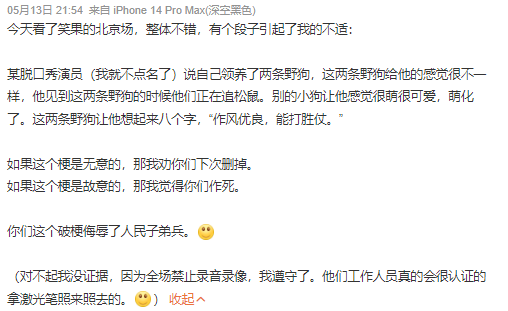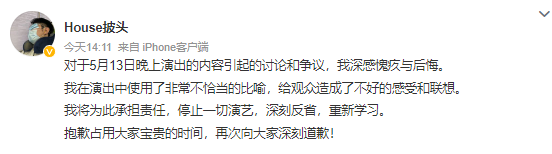 5月15日,脱口秀演员@House披头 发文称:对于5月13日晚上演出的内容引起的讨论和争议,我深感愧疚与后悔。我在演出中使用了非常不恰当的比喻,给观众造成了不好的感受和联想。我将为此承担责任,停止一切演艺,深刻反省,重新学习。抱歉占用大家宝贵的时间,再次向大家深刻道歉!