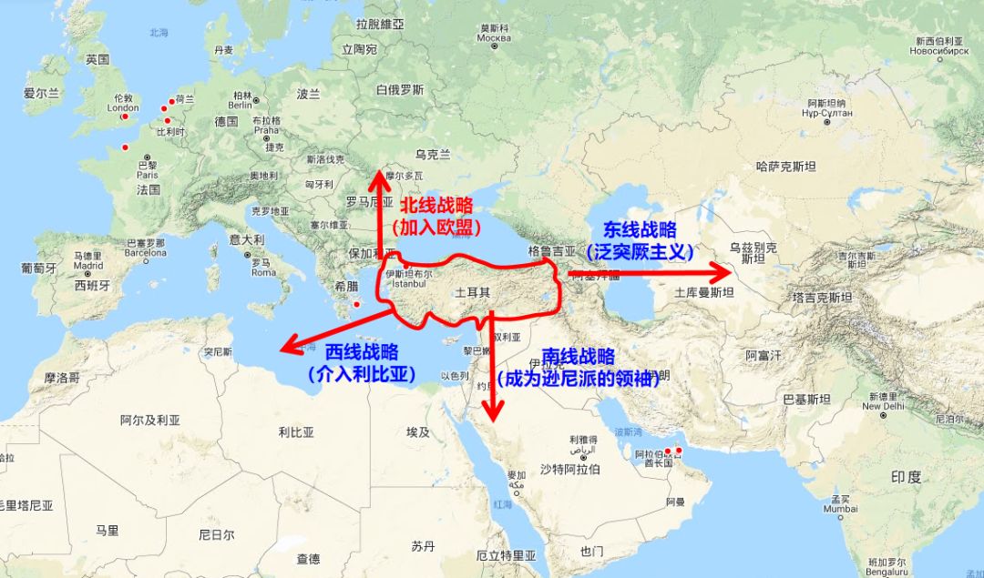 埃尔多安是一个有野心的人,他一直想恢复奥斯曼帝国的风采,所以他制定了土耳其的战略目标:由于土耳其地理位置极好,所以可以向各个方向拓展,分别为东线战略、西线战略、北线战略和南线战略。