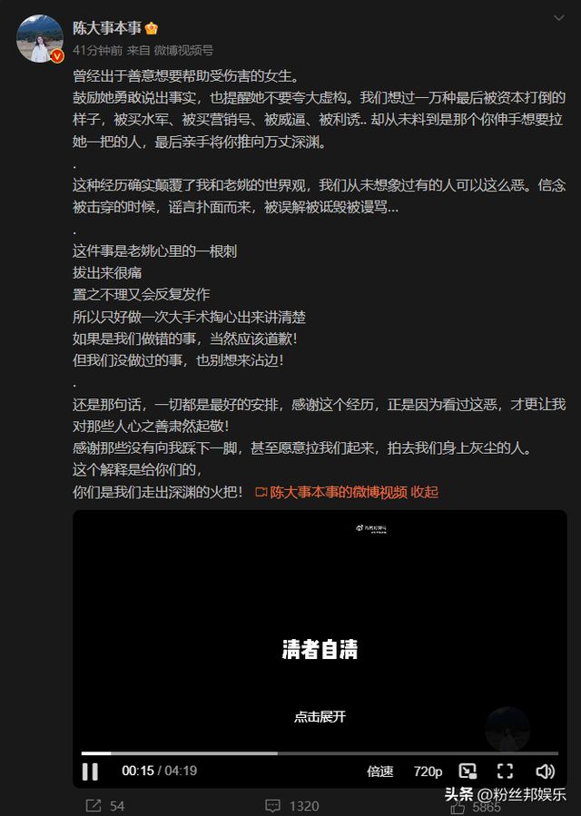 与此同时,此事件的另一对当事人“巧乐兹夫妇”也在微博发布了视频进行回应。并且在文中表示,从未料到是那个你伸手想要拉她一把的人,最后亲手将你推向万丈深渊。