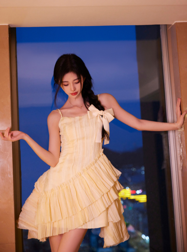 鞠婧祎的一组美图曝光,她身穿吊带黄裙露出纤细美腿,将长发扎成单侧麻花辫甜美可人,整个人又纯又欲,颜值超高美出新高度!