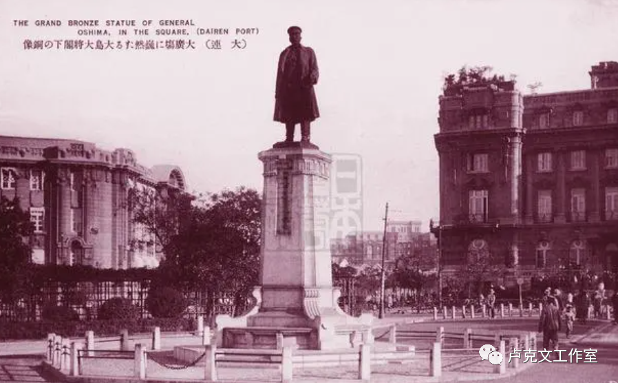 中心广场被日本人改名叫大广场,中心处1914年立了日本关东第一任都督大岛义昌的黑色铜像,解放后哪能忍,鬼子铜像当然给拆掉了。