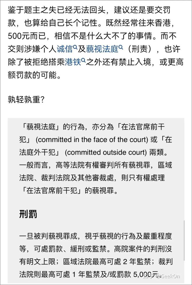 还有网友称,如果不交涉嫌个人诚信及藐视法庭(刑责),也许除了被拒绝搭乘港铁之外还有禁止入境,或更高额罚款的可能。