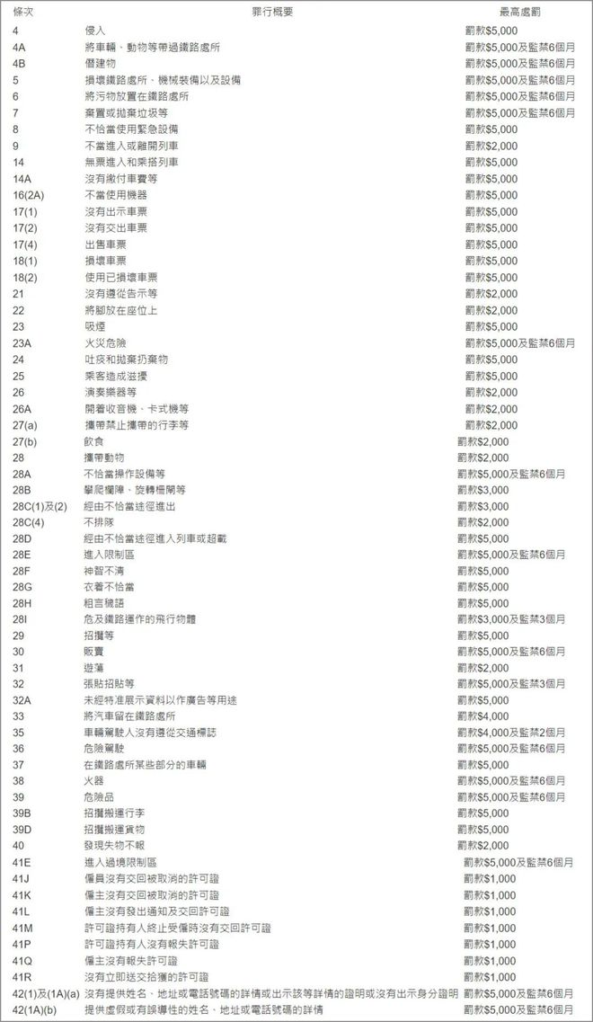 此外还有:不能在未获得港铁授权的情况下,进行访问、拍摄、或者录像等,最高罚款5000港币;放脚在座位上罚款2000港币;神志不清(如醉酒)罚款5000港币;在港铁游荡罚款2000港币…