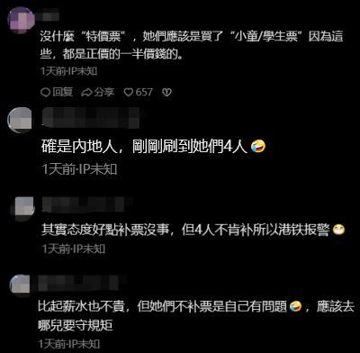 有人怀疑涉事女子是“内地游客”,甚至有人揣测她们购买了仅供儿童和老人使用的特惠票,被发现后“不肯补票”所以港铁报警。还有人觉得港铁小题大做,针对游客。