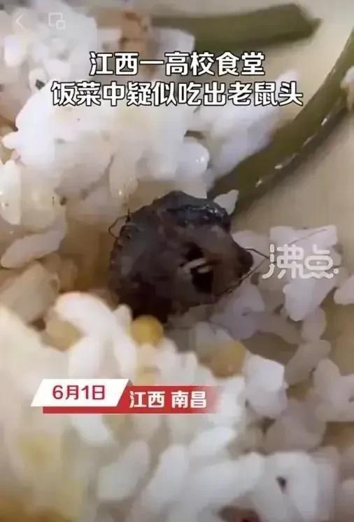 网传,6月1日,江西工业职业技术学院学生在食堂饭菜中吃出老鼠头,而学生的表态可以说是判若两人,事态发酵后学生又发视频称是“自己看错了”,但从视频给出的画面来看,的确很像老鼠头。