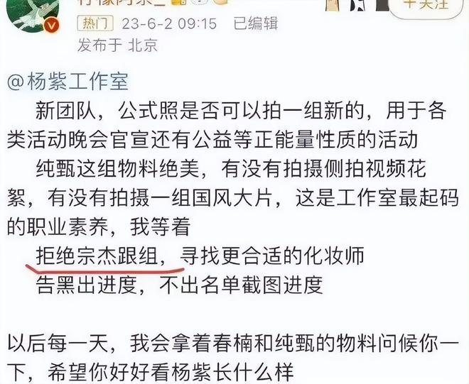之前的芭莎盛典导致杨紫造型被群嘲出圈,粉丝将全部怒气都洒在了化妆师身上,认为是化妆师水平太拉胯,才导致杨紫受了这波无妄之灾,被嘲讽是西门大妈,化妆师宗杰接连几天被杨紫粉丝追着骂,导致宗杰不得不将认领微博删除,不愿意再和这件事有牵扯。
