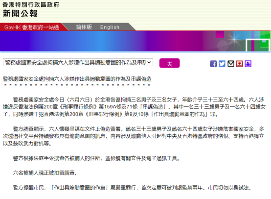 新闻公报称,香港警方调查显示,6人疑似串谋在文件上伪造签署。其中一名33岁的男子及一名64岁的女子同时涉嫌危害国家安全,多次通过社交平台持续发布具有煽动意图的信息,内容涉及煽动他人引起对中央及香港特区政府的憎恨、支持“香港独立”以及鼓吹武力对抗等。香港警方根据法庭手令搜查各被拘捕人的住所,并检获有关文件及电子通讯工具。