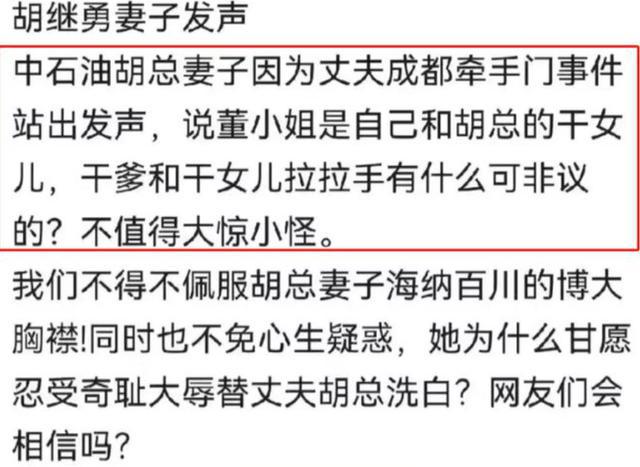 该发文以胡总本人为第一视角,称他之所以会牵董小姐的手,是因为街拍摄影师看两人气质非凡,希望他们能配合一下拍摄,拗不过摄影师的胡总只能本着成人之美,勉为其难地答应下来,却不曾想造成这么大的乌龙。
