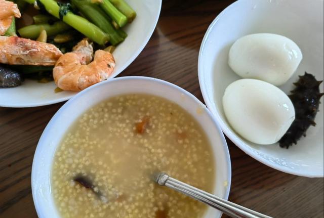 妈妈不仅给孙天祥准备了海参补身子,连这个小米粥里也加了枸杞和红枣,甜滋滋的吃起来营养丰富味道还好。如果不想吃小米粥了,那么就来一碗热腾腾的虾仁馄饨,汤底有紫菜和大虾仁,馄饨是芹菜猪肉馅儿,又鲜又入味。