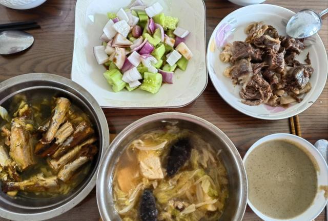 孙天祥有时候自己都觉得妈妈在做满汉全席,早餐太丰盛,自己根本吃不过来。高压锅压好的牛腱子肉,已经软烂到入口化渣。妈妈还蒸了咸鱼干,咸香可口,搭配杂酱糊糊那叫一个美味。还有这个炖白菜豆腐,可不是普通的白菜豆腐,两根海参那么醒目,看着就觉得好吃。还有爽口的拌黄瓜,清清淡淡地解腻开胃。