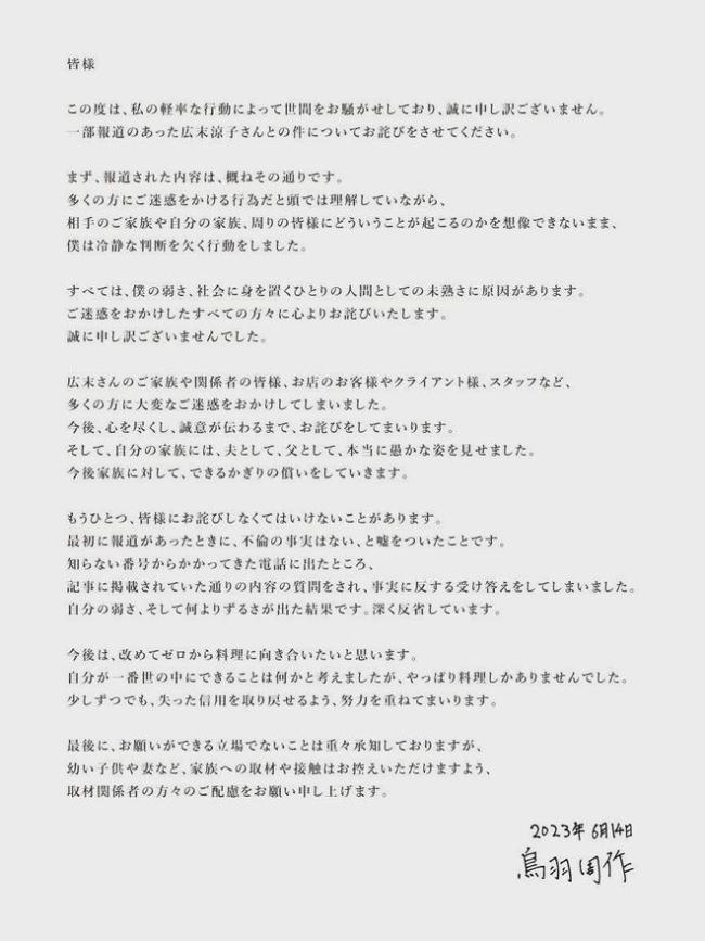 鸟羽周作向广末凉子的家人、客户及工作人员道歉,向自己的家人、妻子、孩子道歉,今后会尽可能地补偿家人。