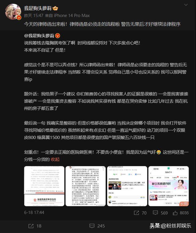 “狗头萝莉”表示律师函是必须要走的程序了,说她筹钱去整容就夸张了啊 ,时间线都没捋对。