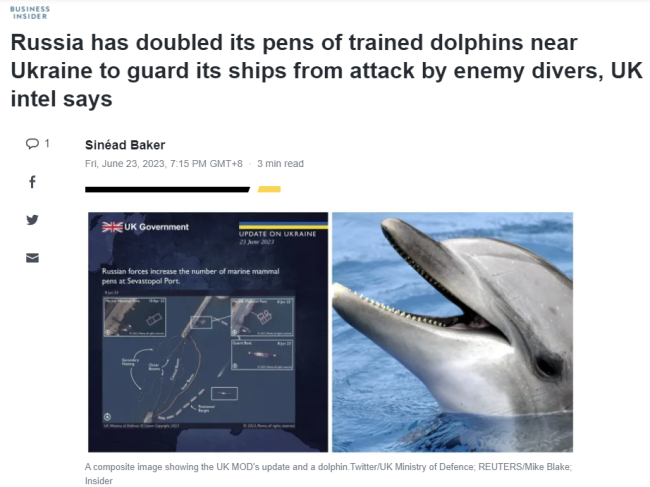 英国国防部声称,近期在克里米亚的海港,俄罗斯正在显著地增加用于军事训练的海豚数量,目的是守护黑海舰队和克里米亚。 还记得上个月月底那头不知道为什么游到瑞典的“弗拉基米尔·鲸”吗?至今还没有人证明或为那头白鲸洗清“俄罗斯间谍”的罪名,23日英国国防部的一篇推文,使它一下子又多了一群“战友”。 综合美国《新闻周刊》和“商业内幕”网站报道,英国国防部23日在一份情报更新中表示,俄罗斯已经将黑海战略港口塞瓦斯托波尔港及其周围的海洋哺乳动物的围栏数量增加了一倍。情报称,这是俄罗斯自2022年夏季以来“加强黑海舰队在塞瓦斯托波尔主要基地安全投资”的一部分。 英国国防部表示,俄罗斯增加了黑海舰队的安全措施,包括在港口入口处设置了“至少四层网和围栏”。“最近几周,训练有素的海洋哺乳动物数量的增加很可能也加强了这些防御,”“图像显示,港口漂浮着的哺乳动物围栏几乎翻了一番,其中很可能有瓶鼻海豚。”报告补充说,这些动物“很可能是用来对抗敌方潜水员的”。 英国国防部公布的照片日期分别是2023年4月10日和2023年6月8日,通过对比试图表明,塞瓦斯托波尔港口的海洋哺乳动物围栏数量有明显增加。 “在北极水域,海军也使用白鲸和海豹,”英国国防部说。 美国海军学院今年早些时候表示,在港口入口处放置海豚,可以阻止乌克兰特种作战部队从水下进入港口,不过该学院指出,尚不清楚乌克兰特种部队是否有这种攻击计划。 23日,美国《新闻周刊》网站公布了一张资料图显示,1992年4月,乌克兰军人在克里米亚半岛的海洋馆对海洋动物进行军事训练。报道称,当年,海豚和海豹也被乌军用来搜索和排除水雷。 “海军新闻”网本月14日曾报道称,海豚是俄军复杂多层防御系统的一部分,这个多层防御系统包括网、浮动屏障、反舰导弹、专业火炮和S-300/S-400远程防空系统。
