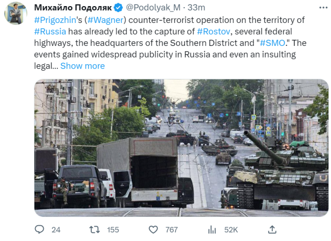 波多利亚克在推文中说,“普里戈任(‘瓦格纳’)在俄罗斯境内的反恐行动已导致罗斯托夫、数条联邦高速公路、特别军事行动南部军区总部被占领。这些事件在俄罗斯引起广泛关注,甚至俄罗斯联邦安全局、国家反恐委员会和总检察长办公室进行了侮辱性的法律评估。精英阶层之间的分歧太明显了。同意和假装一切都解决了是行不通的,一定会有人失败,要么是普里戈任以致命结局结束,要么是‘反普里戈任’集体结束,一切在俄罗斯才刚刚开始”。