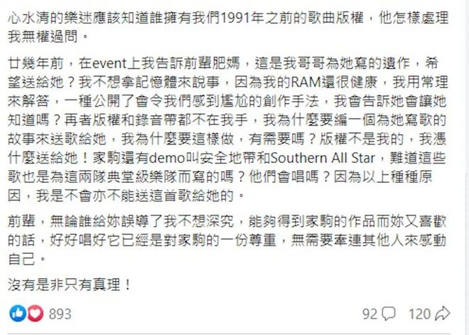 继昨日肥妈在Facebook上传录音带照片证清白,指黄家驹生前确实写过歌曲给自己后,今早黄家强长文再回应肥妈,暗指家驹没有为她写歌。
