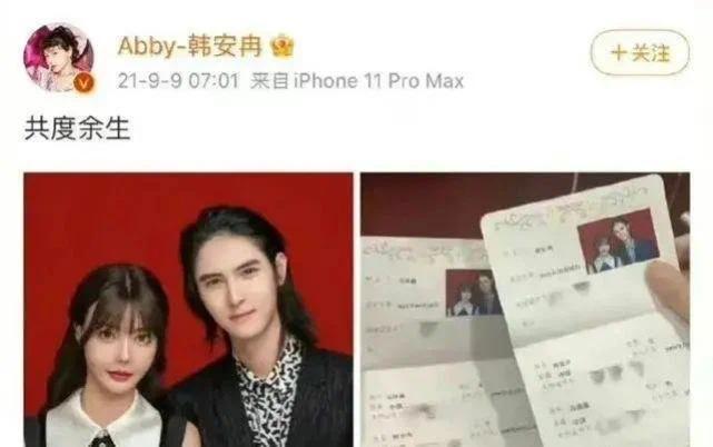 9个月后,12月23日韩安冉就在微博上公布了离婚证,并发文“别骂我了,抱抱我吧”表达自己的伤感,疑似在婚内和对方产生了很大的摩擦。