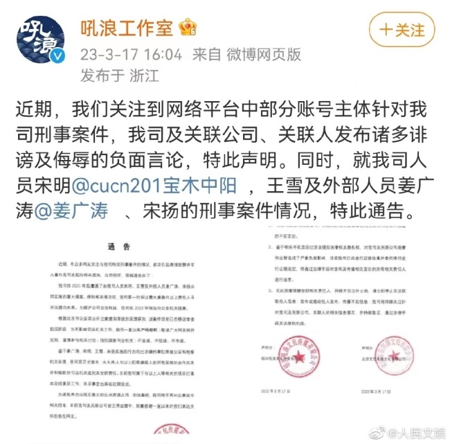 鉴于姜广涛、宋明、王雪、宋扬实施的行为均已涉嫌刑事犯罪被公安和检察机关处理,吼浪工作室正式宣布:永久终止与以上犯罪嫌疑人在所有层面的合作关系并积极配合司法机关追究其全部责任。