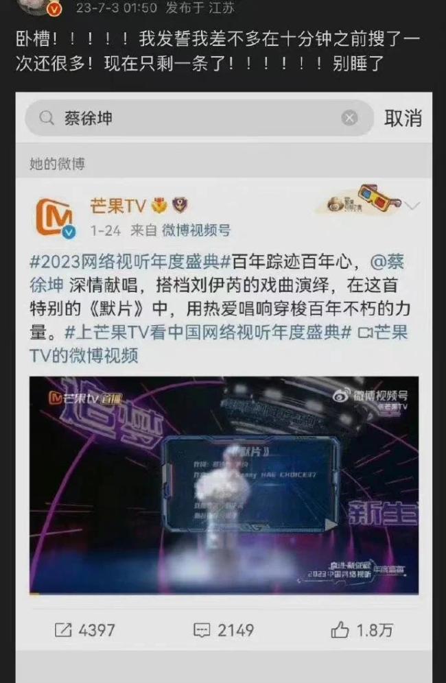 7月2日,有网友发现央视频下架了歌手蔡徐坤的相关视频。