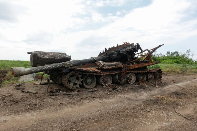 乌克兰札波罗结地区一辆被摧毁的俄军战车。路透社