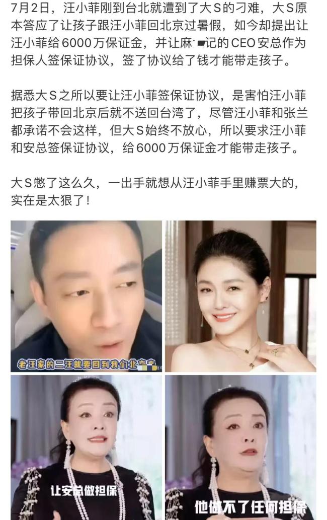 网上还有传闻称,大S不让孩子们回北京,除非麻X记CEO担保,并拿出6000千万保证金。因为不愿给钱,所以汪小菲没能带回孩子。
