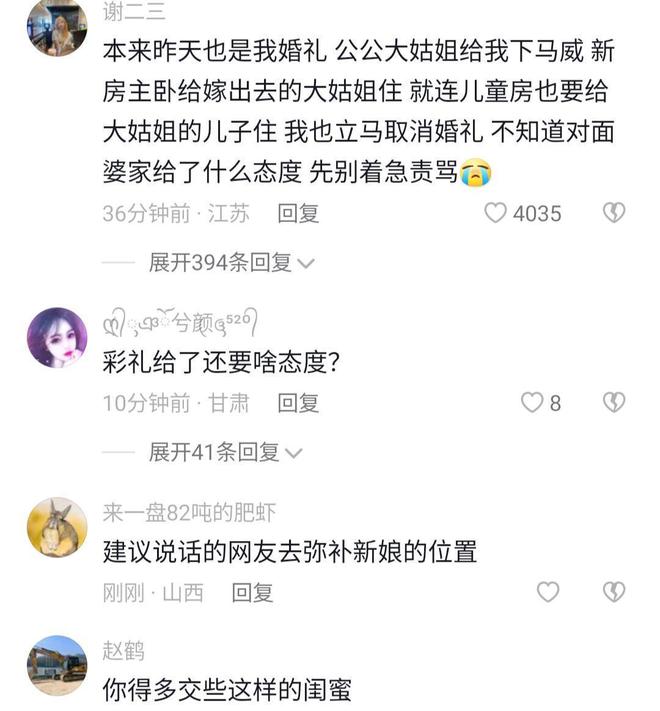 也还有网友评论说,男方家人在婚礼上就给新娘下马威,新娘凭什么惯着他们?那些指责新娘的,拜托你们替新娘嫁过去吧。