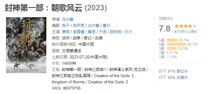 答案显然是否定的,且不说《封神》在某瓣上7.8分的评分,单单上映13天以来取得的超12亿票房、多达两千多万人观看足以说明问题。