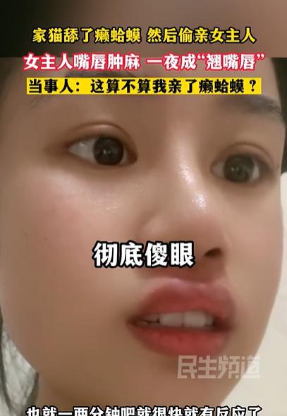 给猫舔了之后,癞蛤蟆皮肤上的毒素就从猫的舌头上转移到了女主人的嘴唇上,女主人感觉自己一下子就中招了。