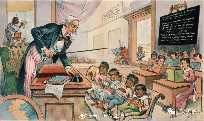 这是1899年一幅美国漫画。前排坐着四个“坏学生”:菲律宾、夏威夷(双手交叉者)、波多黎各、古巴。
