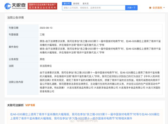 天眼查App显示,8月13日,法院刊登大连沧海笑食品有限公司等4家公司向易烊千玺致歉的公告。公告称,4家公司在食材电商节活动展位上使用了易烊千玺肖像的大幅海报,并在海报中注明“易烊千玺形象代言人”字样。公司已深刻认识到该行为侵犯了易烊千玺的肖像权和姓名权,向易烊千玺公开赔礼道歉。公司愿意承担法律责任,主动履行生效判决所确认的义务。