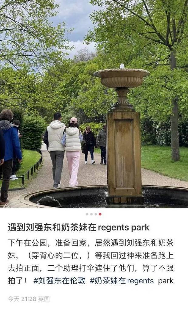 5月1日,有网友在英国伦敦的“摄政公园”偶遇刘强东跟太太章泽天,两人穿着情侣装挽手散步,看起来十分恩爱。