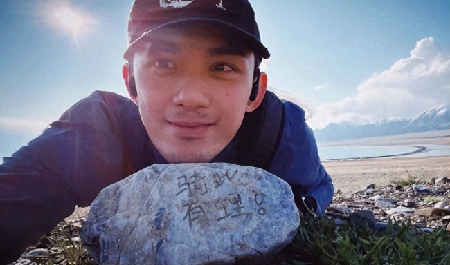 吴磊和写着“骑有此理”的石头合影。