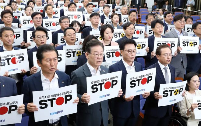 南韩最大在野党「共同民主党」党魁李在明(前排左二)与议员,上周在首尔国会举行的紧急会议上,抗议日本核处理水排海。