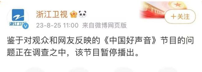 2023年8月25日上午11时,浙江卫视官方微博发布了一条公告,宣布因对观众和网友反映的问题正在进行调查,暂停播出备受欢迎的综艺节目《中国好声音》。这条消息迅速引发了广泛的关注和讨论,在当天晚些时候,星空华文也发布了一份公告,表示全力支持浙江卫视的决定和行动。