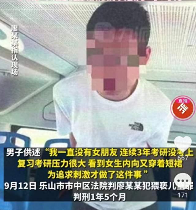 8月10号,廖某某投案自首了,他承认自己猥亵了这位女孩,愿意认罪认罚。廖某某自首后解释,他知道错了。这些年,他一直没有女朋友,再加上连续3年考研落榜,复习考研压力比较大,看到女孩子穿着短裙,为了追求刺激,才一时动了歪心,做了这件事。